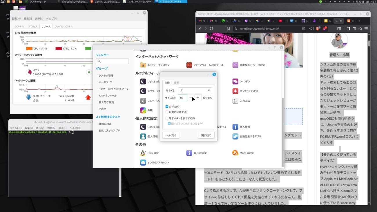 正直なところ、Linux Mintでは、主にBraveブラウザとターミナルぐらいしか使用しないので、デスクトップ環境もCinamonで不便は特になかったのですが(^^;